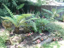 A shaded position was chosen for a new fern area which was a theme that the garden lacked. Made from old logs, as a result of willow pollarding, raised beds were formed. The main plants included tree ferns and a variety of evergreen and deciduous ferns, together with Gunnera Manicata, fuchsia "General Bonstedt", heuchera and other plants.